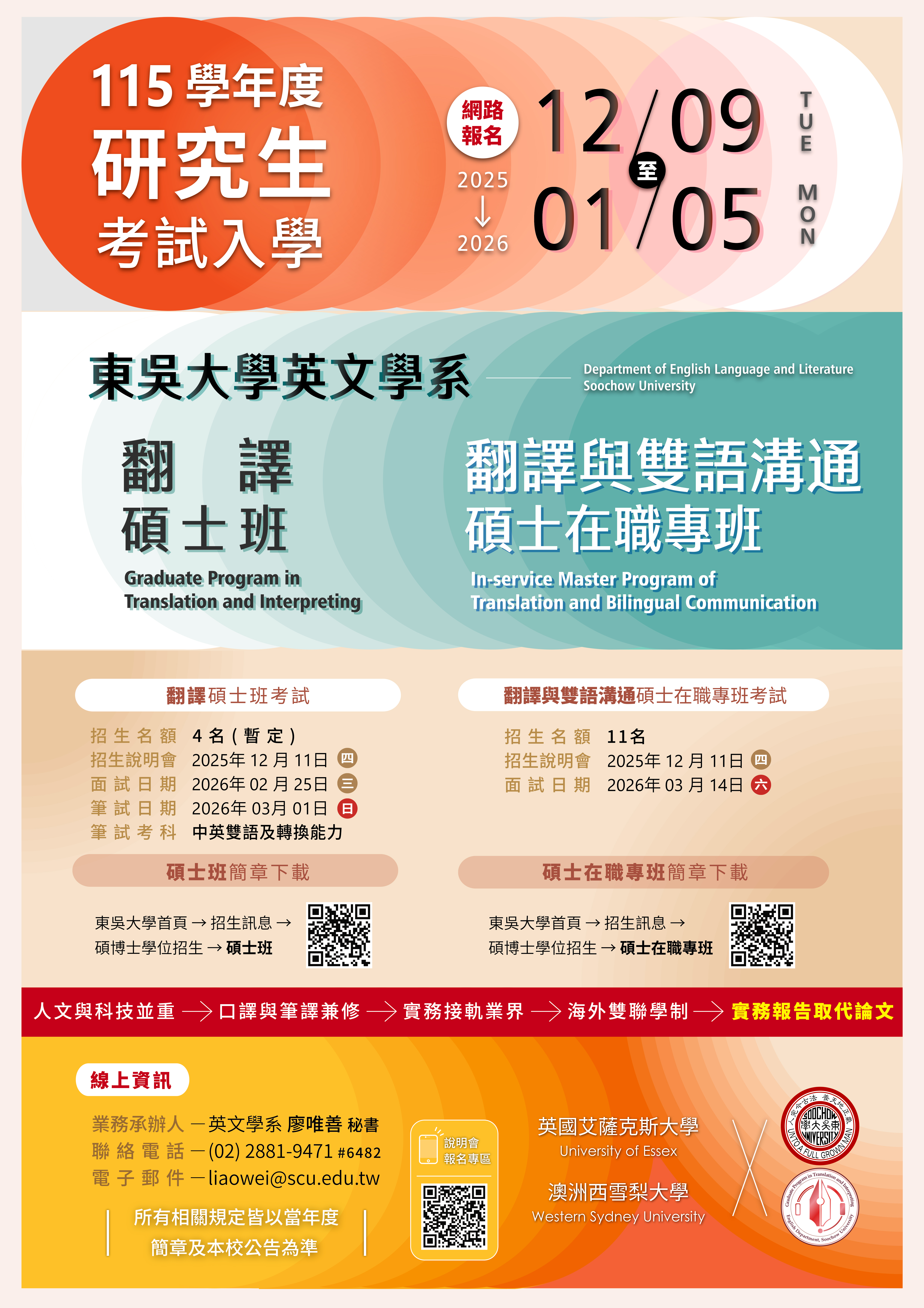 東吳大學英文學系115學年度翻譯與雙語溝通碩士在職專班招生中,請有興趣同仁踴躍報名。